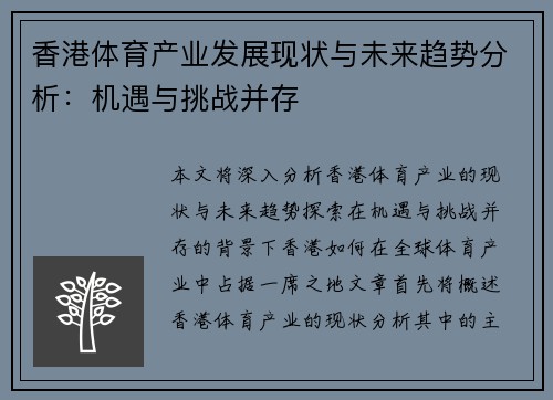 本文将深入分析香港体育产业的现状与未来趋势,探索在机遇与挑战并存的背景下,香港如何在全球体育产业中占据一席之地。文章首先将概述香港体育产业的现状,分析其中的主要机遇和挑战;接着,从四个方面具体探讨体育产业的发展动向,包括政府政策支持、基础设施建设、国际赛事吸引力及公众参与度等。每个方面将阐述其对香港体育产业发展的推动作用及面临的具体问题。最后,文章将在总结部分进行全面归纳,提出对未来发展的展望,力求为香港体育产业的创新发展提供建设性的意见。